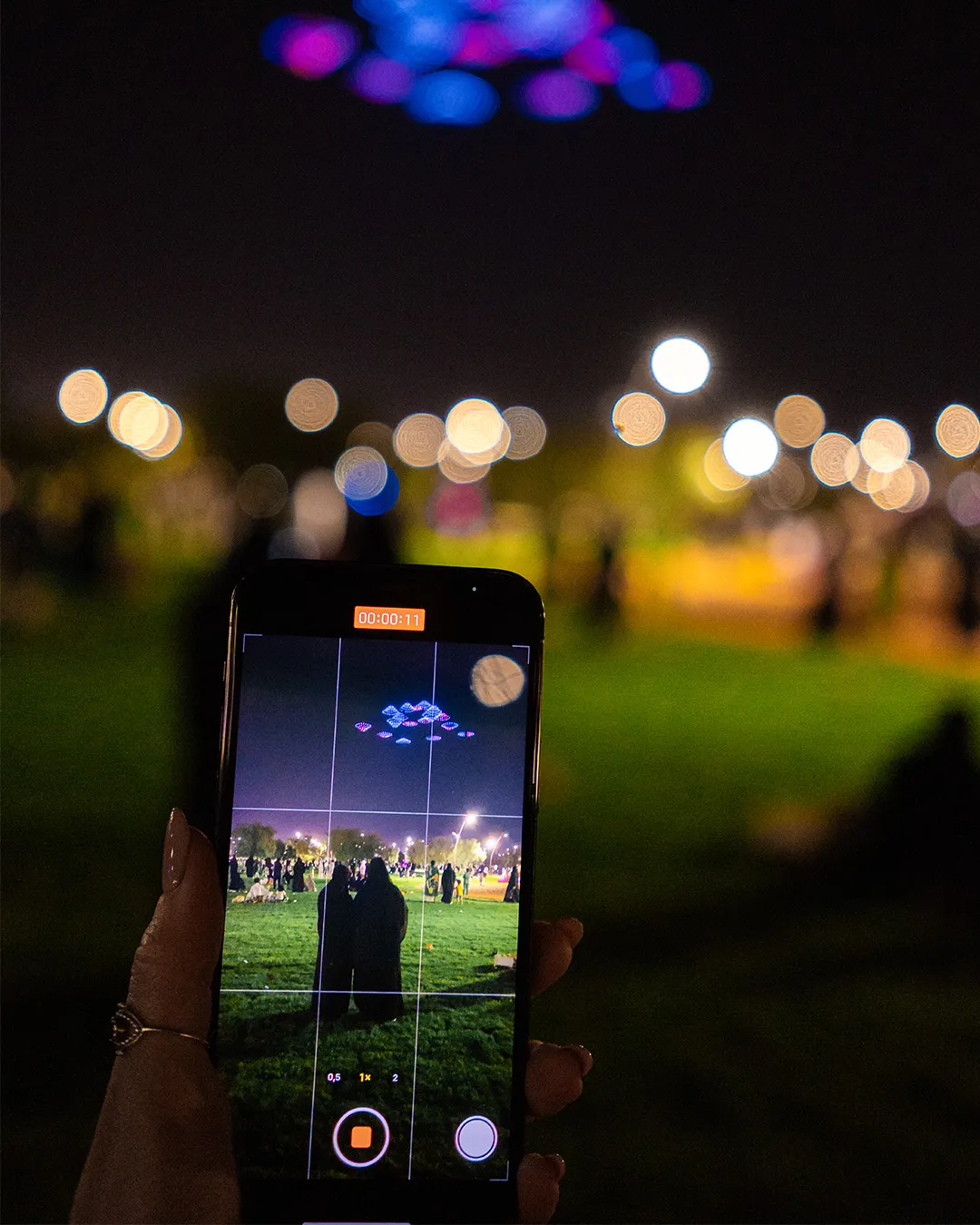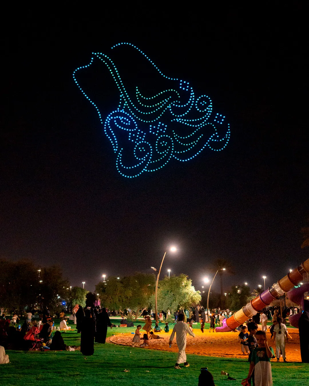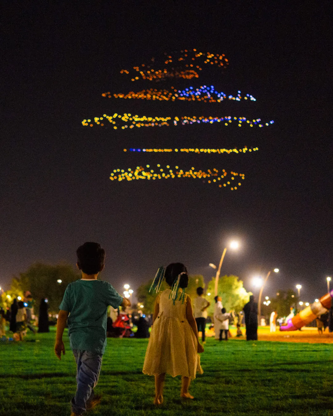 Die Stadt liegt in einer Oase in der riesigen Najd-Wüste und ist berühmt für ihre saftigen Datteln. Als historischer Knotenpunkt von Handelswegen ist sie von antiken Relikten umgeben, die Geschichten aus ihrer geschäftigen Vergangenheit erzählen. Stellen Sie sich das Spektakel einer modernen Drohnenshow vor, die den Himmel über diesem historischen Kernland beleuchtet. Bemerkenswerterweise schuf diese Verschmelzung von fortschrittlicher Technologie mit zeitlosen Landschaften eine Szene von unerwarteter Schönheit und Harmonie.