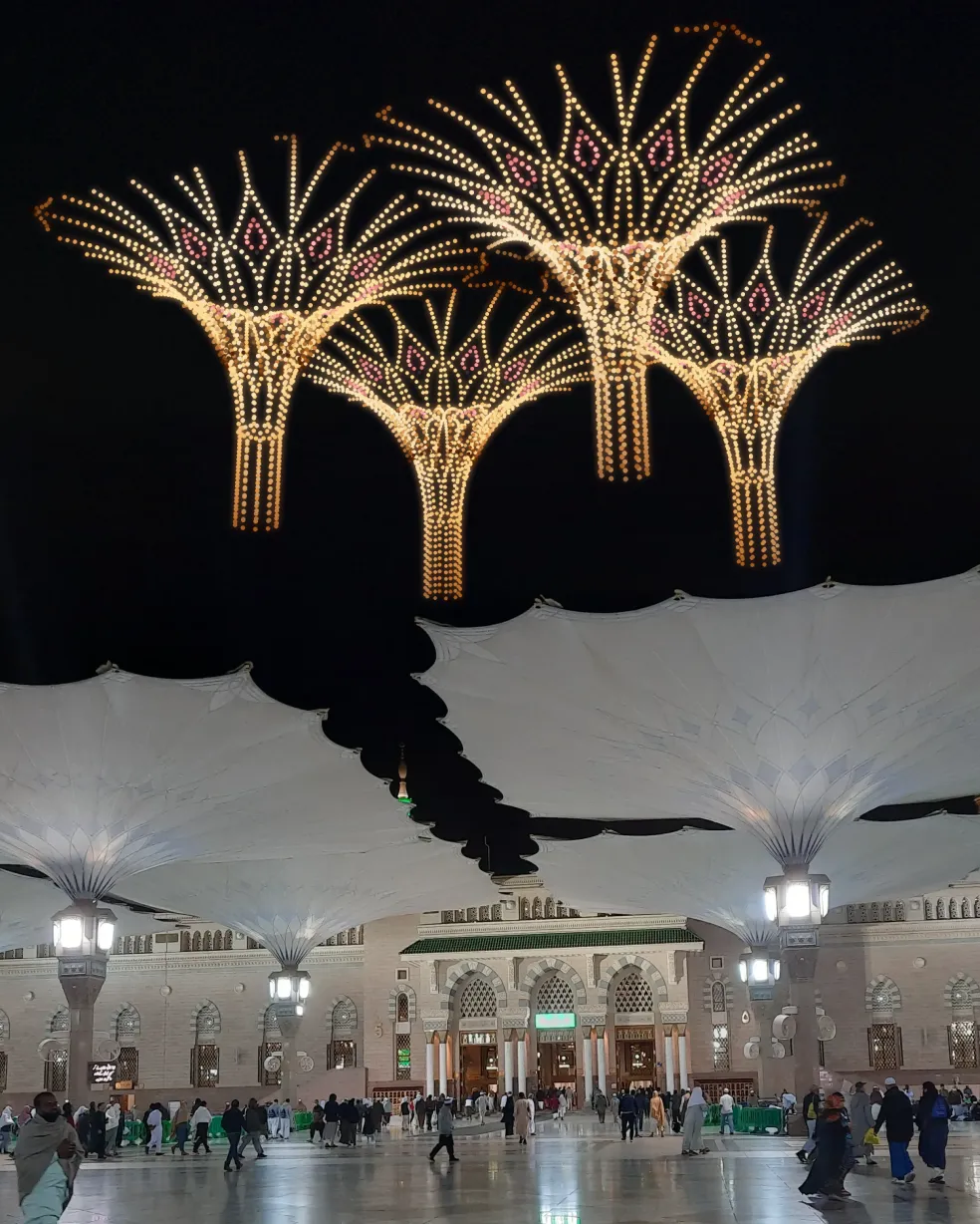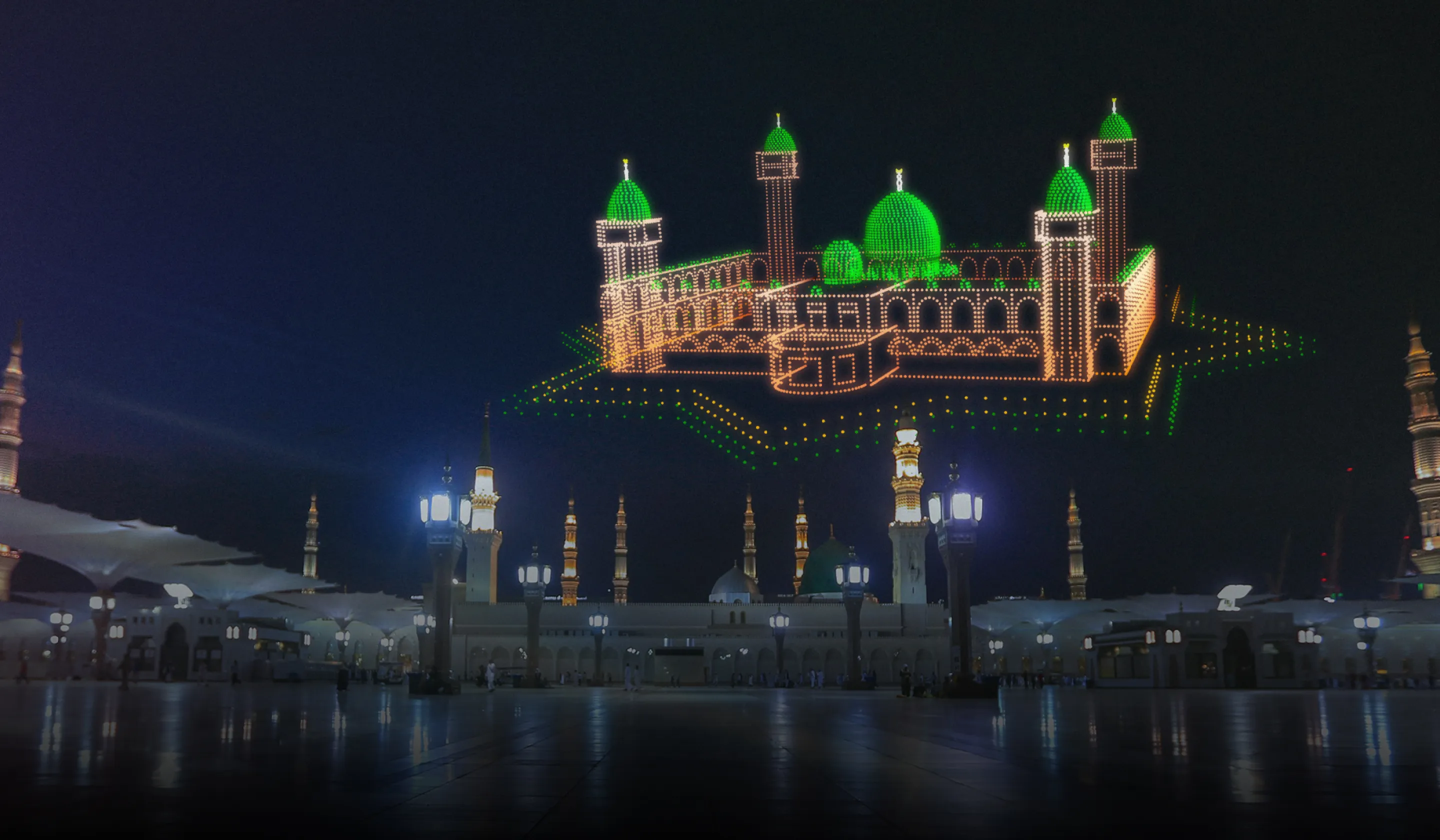 In Medina, that matters. We design every sequence for approved distances and a respectful tone, always honoring the protected core around the Prophet’s Mosque. The visuals stay native to the place: Arabic calligraphy traced in light, mashrabiya geometry that “glints” on the beat, crescents and palm motifs crowned with a pinpoint spark, a quiet skyline outline punctuated by synchronized micro-bursts for the finale. Sparks aren’t constant fireworks; they’re punctuation—chapter markers that guide the eye through the story.