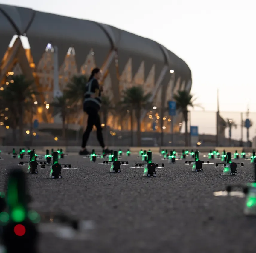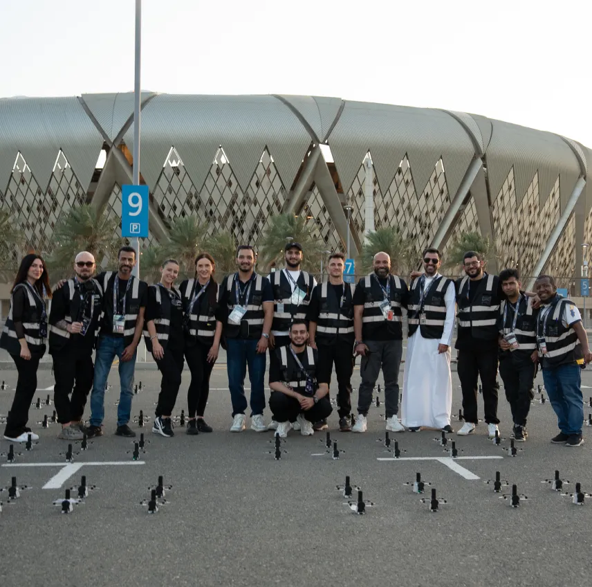 Behind the scenes, our team handles everything end-to-end: GACA and municipal permitting, fallout modeling, safety zoning and on-site coordination with venue and fire services. The system is reusable and low-noise, the effects lock to music and motion, and endurance remains strong—up to 20 minutes aloft, subject to site plan and permissions, so the show reads clearly from parks, stadium complexes, and other approved vantage areas.