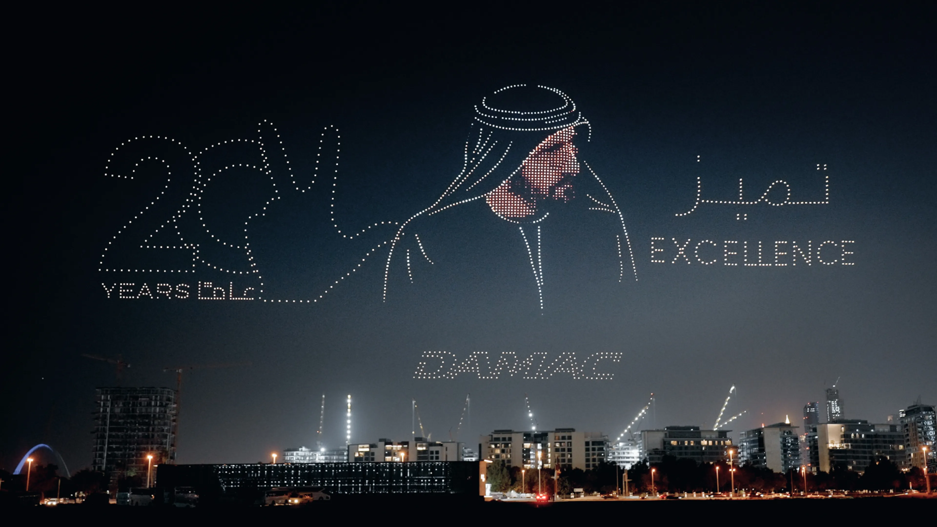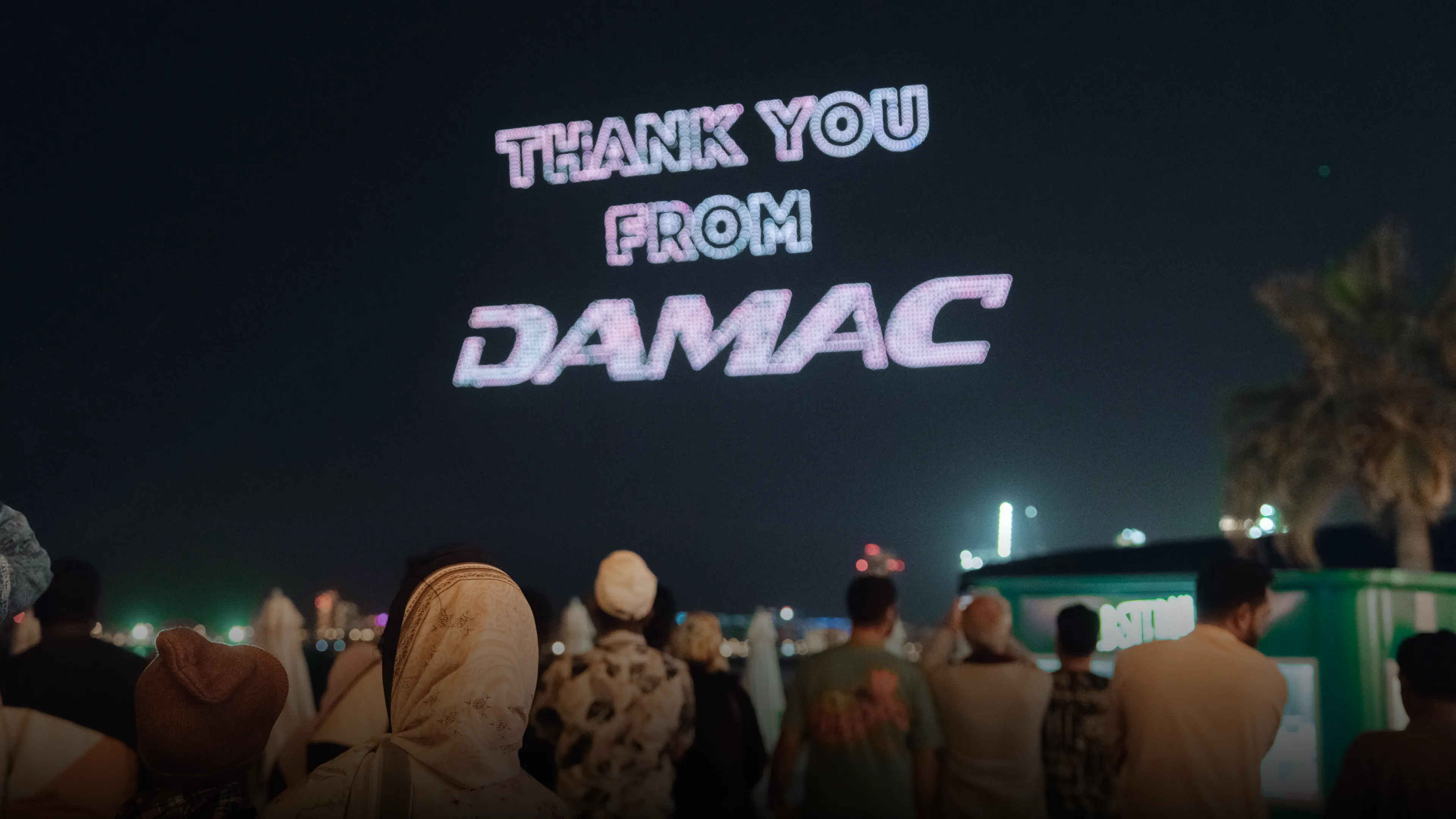 Rather than concentrating all attention on a single performance or location, DAMAC designed the celebration as a citywide moment unfolding in parallel. The drone show was flown simultaneously at two locations, and then repeated later the same evening, extending the tribute across time as well as space.