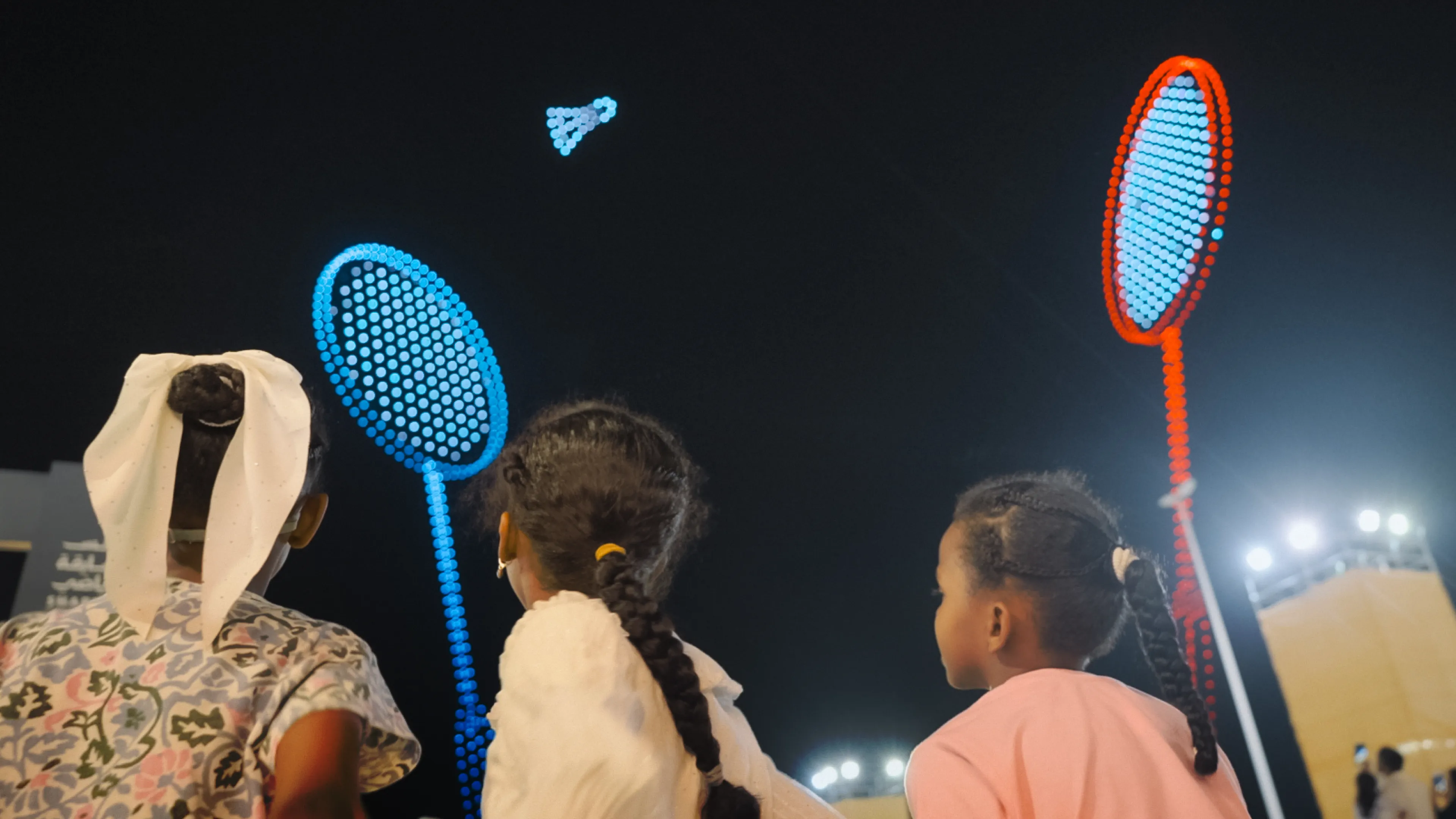 In the sky, we drew a shuttle suspended between two rackets, held in a moment of perfect tension as if the rally could tip either way. Subtle motion in the surrounding drones suggested the invisible arc of play—speed, reflexes, and precision compressed into a single frame. The figure underlined how the Games balance traditional beach staples with newer formats, placing Kalba inside a broader international sports conversation.